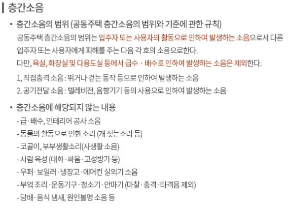 - 사람의 육성(대화, 싸움, 고성방가) 등은 층간소음에 해당하지 않습니다.