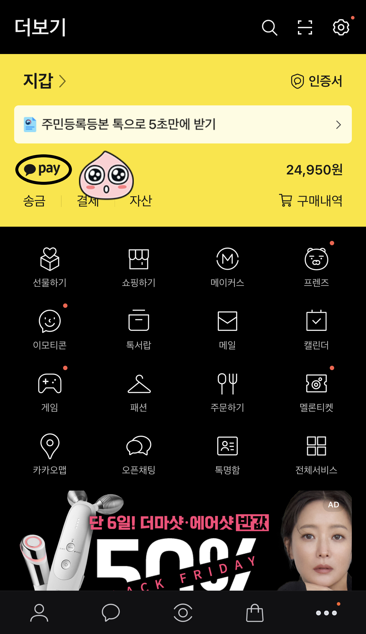 카카오톡 맨 오른쪽 아래에서 '기타'를 눌러 카카오 페이에 들어가 주세요.