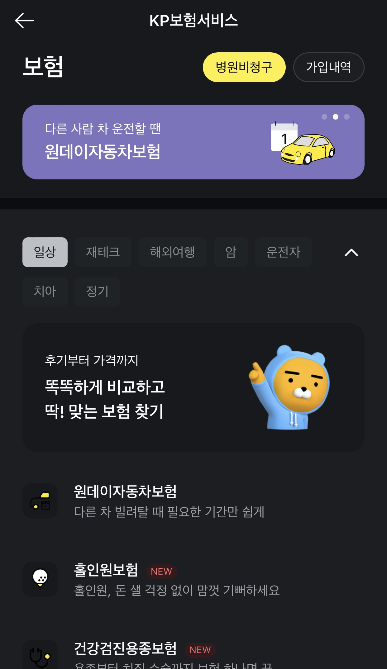 - 카카오톡 -> 카카오페이 -> 보험/청구 -> 원데이자동차 보험